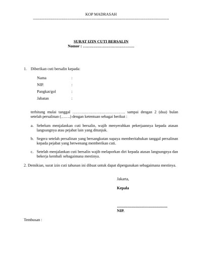 Contoh surat izin pns atau asn format resmi ini merupakan salah referensi yang baik dan benar sesuai harapan anda, bisa digunakan untuk contoh format, download, surat izin cuti bersalin, surat izin cuti besar, surat izin cuti melahirkan, surat izin cuti sakit dengan demikian file tersebut bisa memenuhi dan mengakhiri pencarian di google surat izin cuti melahirkan. Mengajukan surat cuti kerja karena sudah hamil 7 bulan di.
